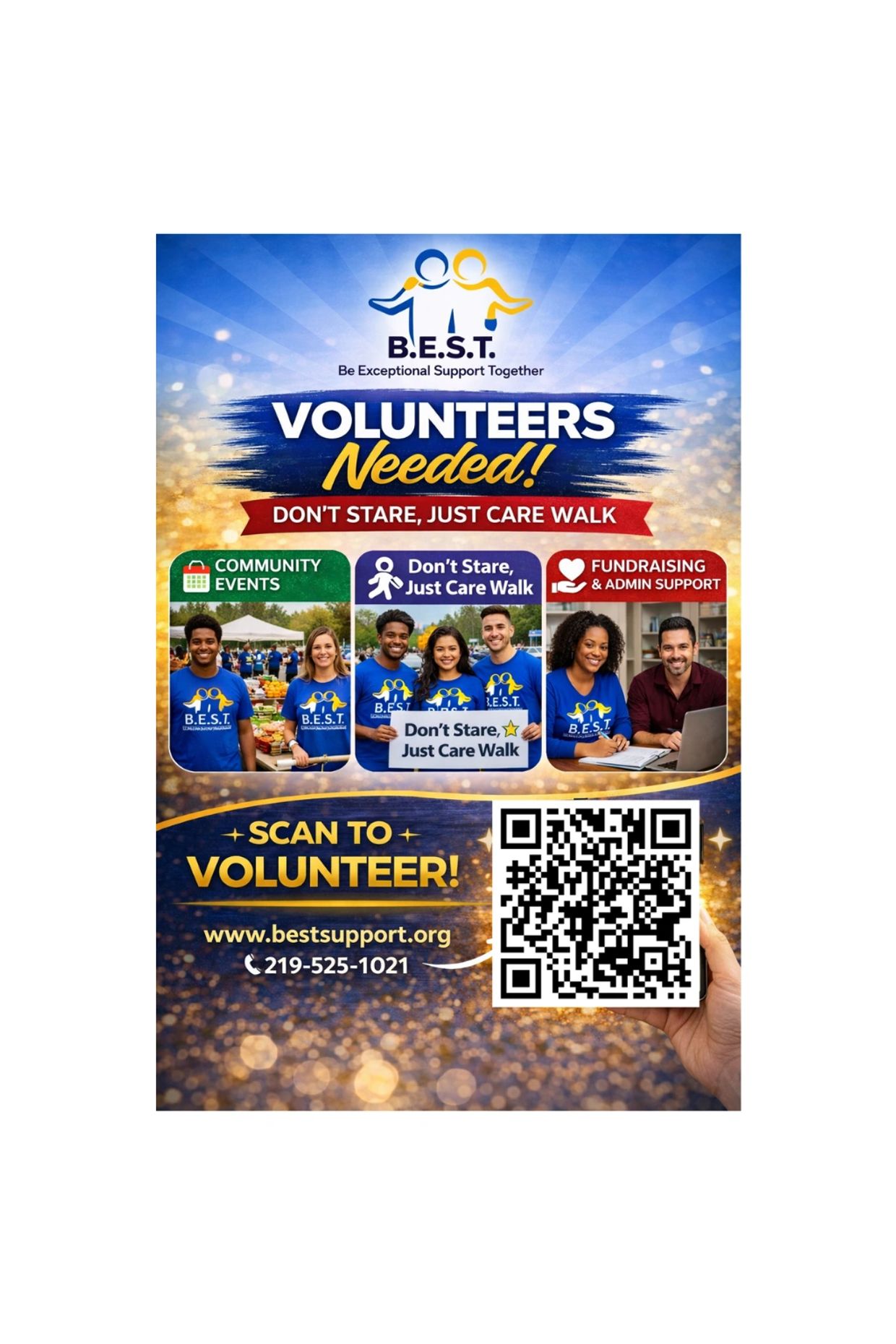 Join Be Exceptional Support Together (B.E.S.T.) and make a meaningful impact in your community. We welcome high school students, young adults, and community members who have a heart to serve. Whether you’re helping at events, supporting our “Don’t Stare, Just Care” Walk, or assisting with outreach and programs, your time and talents help empower individuals with exceptional abilities and their families. Together, we serve, connect, and create change.
